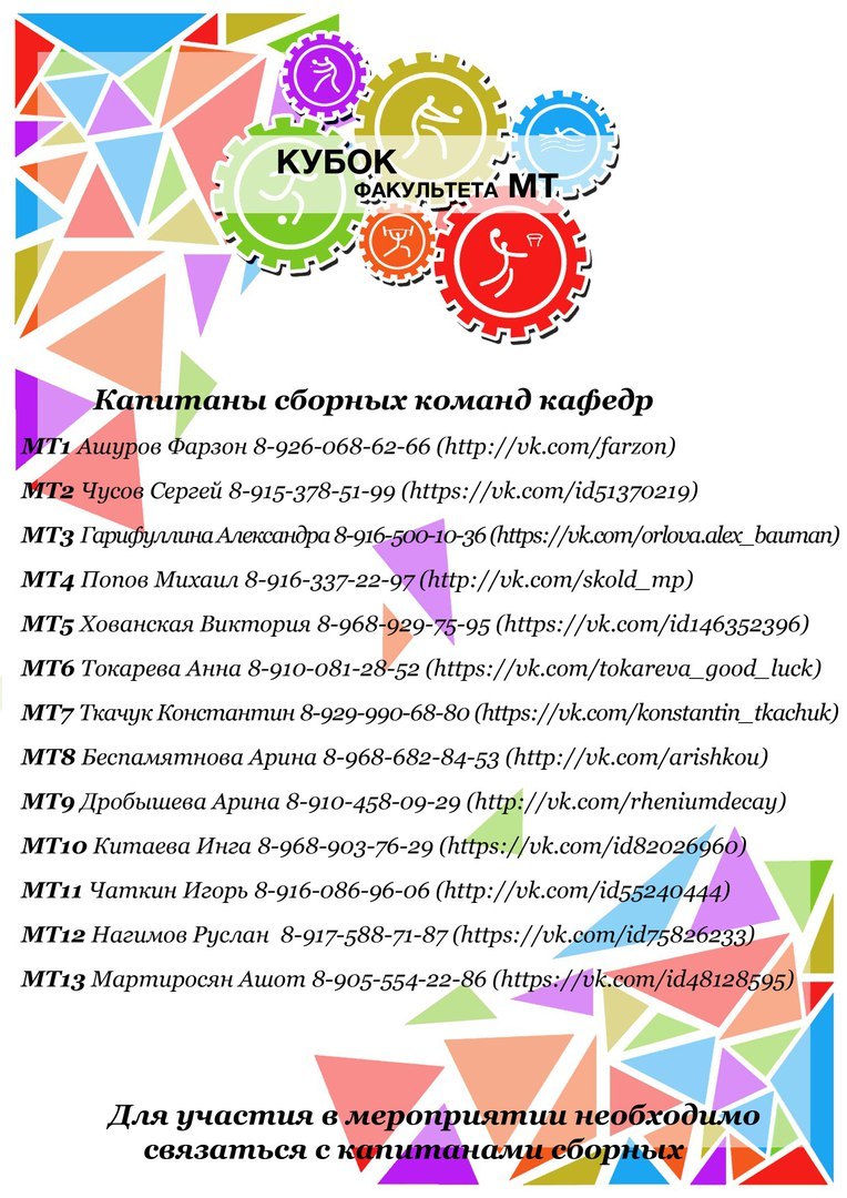 Но не стоит забывать, что уже в это воскресенье 23 апреля в стенах нашего любимого Спортивного комплекса пройдут соревнования по всем видам спорта! Ребята, если вы еще не успели записаться в команду своей кафедры или сомневаетесь, стоит ли принимать участие, то отбросьте все сомнения в сторону! 23 АПРЕЛЯ СК МГТУ им. Н.Э.Баумана ждем всех желающих выступить в следующих видах спорта: