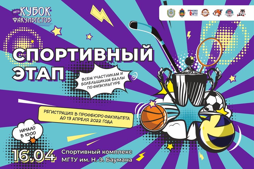 «МетаКубок факультетов 2022». Спортивный этапУважаемые студенты факультета МТ! 18 мая в Большом зале Дворца культуры МГТУ им. Н.Э. Баумана состоится финал ежегодного конкурса МетаКубок ФАКУЛЬТЕТОВ. До финальной точки конкурса среди студентов «МетаКубок факультетов 2022» остался всего один шаг, а на каком месте к нему подойдут команды решится в последний момент. И каждый из ВАС в силах на это повлиять! На предстоящем СПОРТИВНОМ ЭТАПЕ, который пройдёт 16 апреля каждый студент может проявить себя в одной из девяти соревновательных дисциплин и постоять за честь любимого факультета, либо помочь участникам, поддерживая их в течение всего соревновательного дня. Вас ждут турниры по: футболу, лазертагу, волейболу, стритболу, настольному теннису, дартцу, шахматам, киберфутболу и игровая эстафета «Веселые старты». Тем более у нас есть приятный бонус! Всем участникам этапа будут выставлены 4 основных БАЛЛА (2 посещения), а всем болельщикам — 2 дополнительных БАЛЛА, проставляемые в качестве успеваемости по дисциплине «Физическая культура и спорт». Заинтересовало? Для записи в команду обращайся в Профбюро своего факультета до 13 апреля! Дата проведения спортивного этапа: 16 апреля. Начало регистрации в 10:00. Место проведения: Спортивный комплекс МГТУ имени Н.Э. Баумана, находящийся по адресу: Госпитальная наб., д. 4, стр.1. Место проведения турнира по киберфутболу: фойе Малого зала Дворца культуры МГТУ имени Н.Э. Баумана по адресу: ул. 2-ая Бауманская, д. 5, с. 1. (регистрация в 10:00 на месте проведения) |