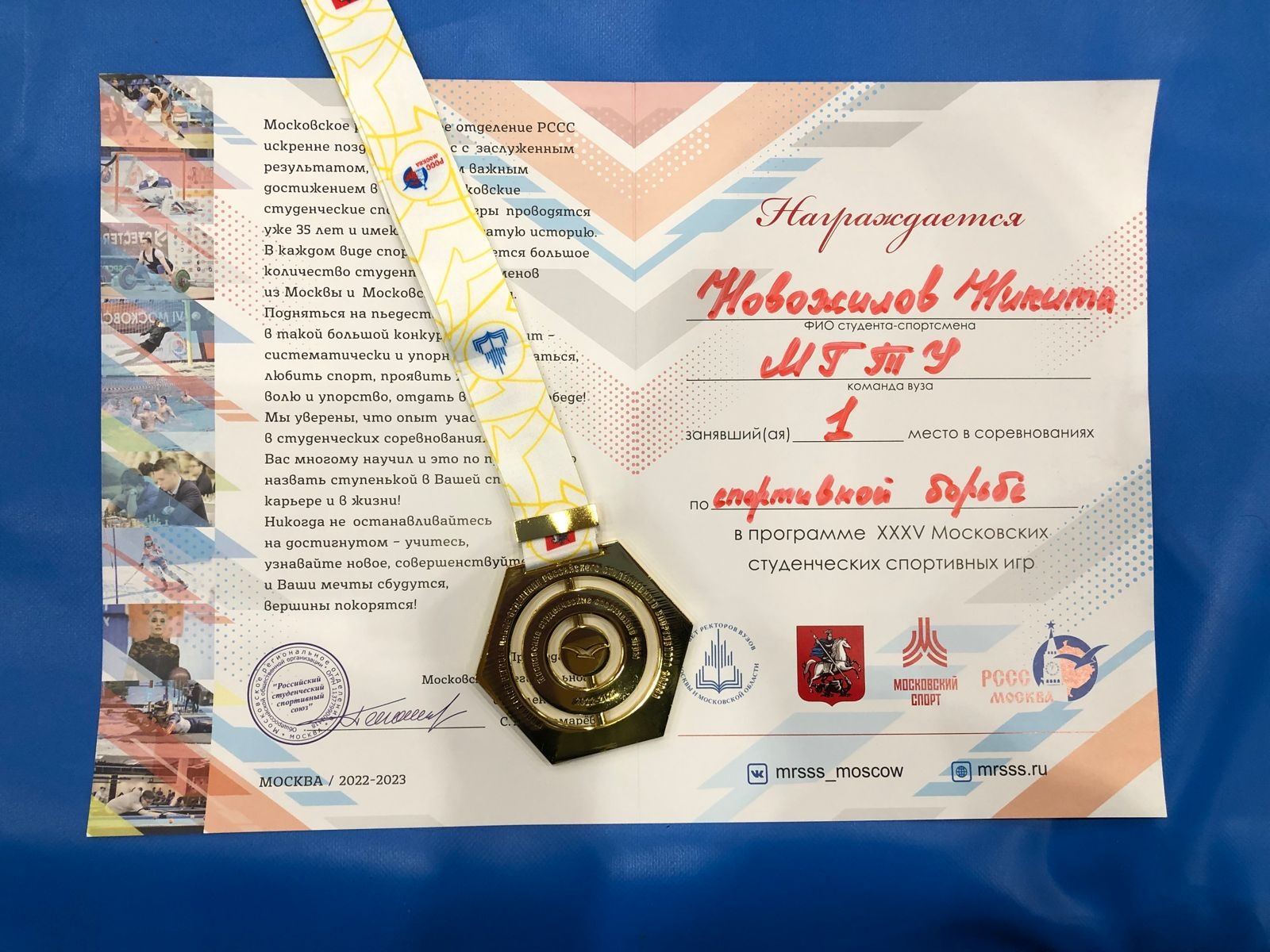 Студент пятого курса факультета МТ МГТУ им. Н.Э. Баумана Никита Новожилов стал победителем соревнований по греко-римской борьбе в весовой категории до 82 кг. Турнир был организован в рамках программы XXXV Московских студенческих спортивных игр и прошел 10-11 декабря во дворце спорта НИУ МГСУ.