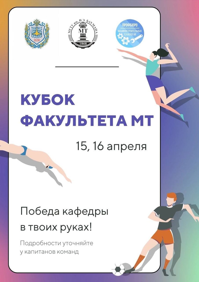 Кубок факультета МТУважаемые студенты и сотрудники факультета! Близится самое масштабное спортивное мероприятие факультета Совсем скоро кафедры будут соревноваться между собой в различных спортивных дисциплинах. Скорее регистрируйтесь и помогите своей кафедре Форма для регистрации !Обратите внимание на дисциплины и даты проведения! 15-16 апреля на базе СК МГТУ — 7 дисциплин: Дисциплина, количество участников(+запасные) 1. Футбол, 6(+4) 2. Волейбол, 6(+4) 3. Стритбол, 3(+2) 4. Плавание, не ограничено 5. Рывок гири, не ограничено 6. Бег (60м, 1000м, эстафета 4х200) эстафета 4, 60 и 1000 не ограничено 7. Перетягивание каната, 7(+4) Футбол: отборочный этап 15 апреля, полуфиналы и финалы 16 апреля Стритбол: 15 апреля Волейбол: 15 апреля Плавание, пернтягивание каната, рывок гири, бег: 16 апреля Оргкомитет соревнований: — Умаров Мурад Мухамедович — главный судья соревнований МС РФ, доцент к.т.н. кафедры «Физическое воспитание». — Балов Андрей — глава спортивного отдела профсоюза студентов факультета МТ. Почетные гости соревнований: — Игнатов Алексей Владимирович — декан факультета «МТ» — Колесников Александр Григорьевич — Руководитель НУК «МТ» — Калинин Андрей Анатольевич — Директор УСС и многие другие. Капитаны по кафедрам: МТ1 Константин Аверкиев МТ2 Андрей Собцов МТ3 Денис Кудринский МТ4 Мария Пламеннова МТ5 Андрей Цапенко МТ6 Валера Кучеренко МТ7 Николай Сидельников МТ8 Михаил Неудобнов МТ9 Ксения Блюдёнова МТ10 Мария Никитина МТ11 Андрей Руденко МТ12 Данил Засыпкин МТ13 Максим Луконин Итоги мероприятия: На высшую ступень пьедестала почёта поднялась команда кафедры «МТ2» и стала обладателем Кубка факультета «Машиностроительные технологии». Второе место в общекомандном зачёте заняла команда кафедры «МТ11». Третье место заняла команда кафедры «МТ8». В ходе состязаний места распределились следующим образом: — Волейбол: 1 место — МТ8 2 место — МТ6 3 место — МТ11 — Футбол: 1 место — МТ11 2 место — МТ13 3 место — МТ1 — Стритбол: 1 место — МТ12 2 место — МТ13 3 место — МТ3 — Перетягивание каната: 1 место — МТ7 2 место — МТ1 3 место — МТ2 — Рывок гири: 1 место — МТ1 2 место — МТ5 3 место — МТ13 — Беговая эстафета: 1 место — МТ6 2 место — МТ2 3 место — МТ8 Фотоотчёт: |