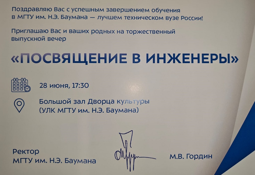 В пятницу, 28 июня в 17:30 в Большом зале Дворца культуры состоится торжественный вечер, посвящённый выпуску инженеров нашего факультета. «Теперь мы не студенты, товарищ дорогой, Теперь мы инженеры, привыкшие к труду, Но сохраним мы в сердце родной МВТУ. Но сохраним мы в сердце родной МВТУ!» (с)неофициальный гимн МГТУ им. Н.Э. Баумана, автор А. Городницкий Приглашаем вас и всех ваших близких разделить радостное событие – окончание обучения в МГТУ им. Н.Э. Баумана. Отчёт о мероприятии: «В этот день в районе станции метро Бауманская было непривычно много молодых людей в белых касках — выпускников МГТУ им. Н.Э. Баумана торжественно посвятили в инженеры. Церемония посвящения, уже давно ставшая традицией, состоялась в большом зале Дворца культуры Учебно-лабораторного корпуса. Там собралось больше тысячи вчерашних студентов, поддержать которых пришли друзья, преподаватели и наставники, помогавшие им овладеть профессией. Много тёплых слов было сказано в этот день в адрес выпускников. Ректор университета Михаил Гордин пожелал им и дальше смело идти по выбранному пути. Напутствия молодым инженерам во взрослую жизнь дали также космонавты с МКС и президент университета Анатолий Александров. По традиции деканы факультетов вручили лучшим студентам памятные подарки: «фирменные» шарфы и белые каски. Самые активные бауманцы, которые проявили себя не только в учёбе, но и в научной, общественной, спортивной и культурной жизни вуза, были награждены серебряными значками за вклад в развитие альма-матер. Завершилась церемония концертом, который продолжился праздничной вечерней программой — бауманскими тазами.» Фотоотчёт: |